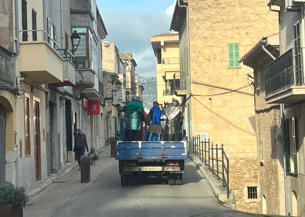 On my way to Selva I got stuck behind this truck with three guys dressed up in strange outfits driving through the village of Campanet and waving to passersby. I was not exactly sure what was going on. The three wise men? Is it really wise to drive around standing up in the back of a flatbed truck? I remember Santa coming through my neighborhood on a fire engine when I was a kid, but this was 8 in the morning, a week before Christmas. It will remain a Mallorca mystery.